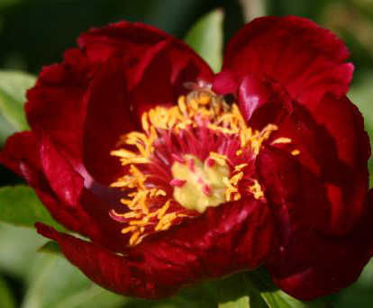 Гибрид. Цветок простой, диаметром 15 см, яркий, красный. В центре золотистые тычинки. Часто они перемешаны с малиновыми петалодиями. Куст компактный, высотой 70 см. Стебли прочные. Листья глянцевые. Срок цветения ранний.