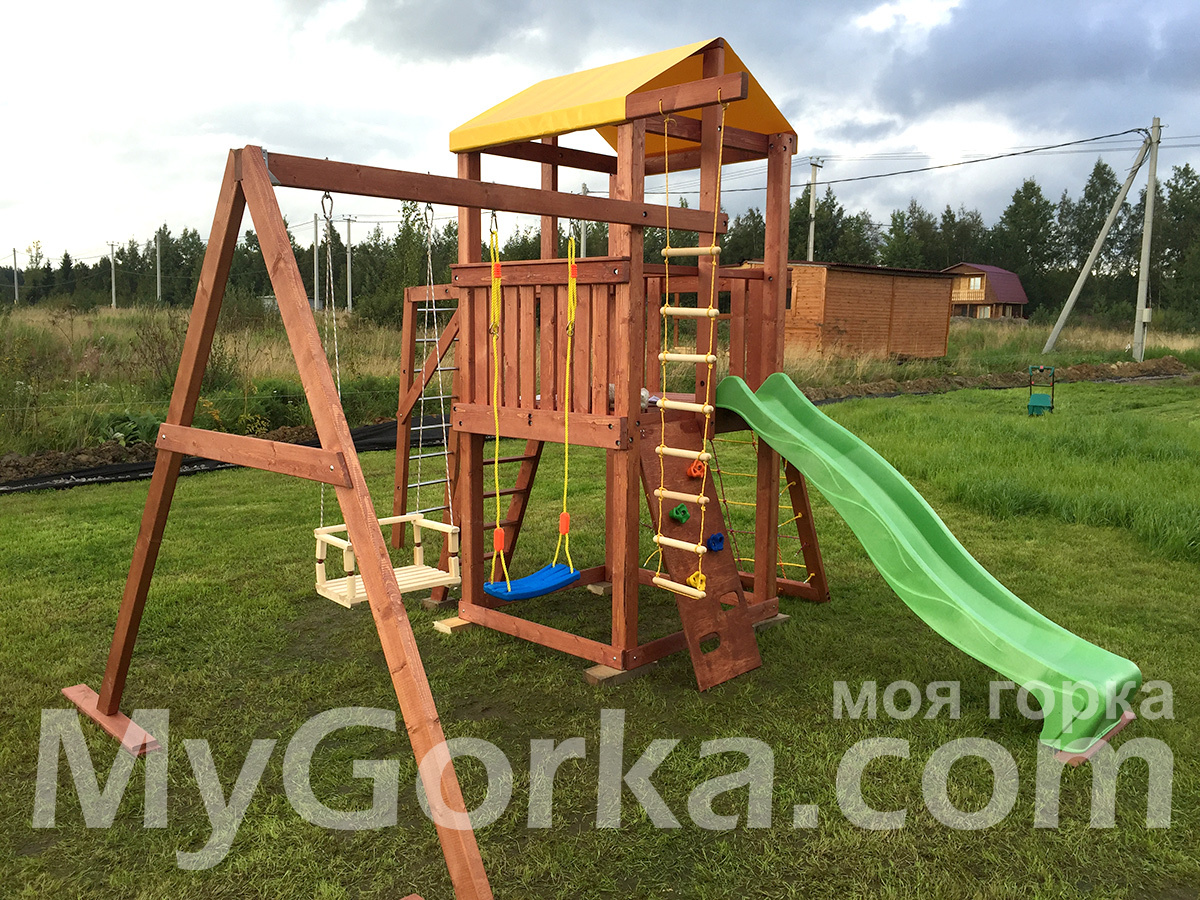 Крыша - тентовая ткань ПВХ (красный или желтый цвет). 1-й этаж расположен на высоте 1,20 м от земли.